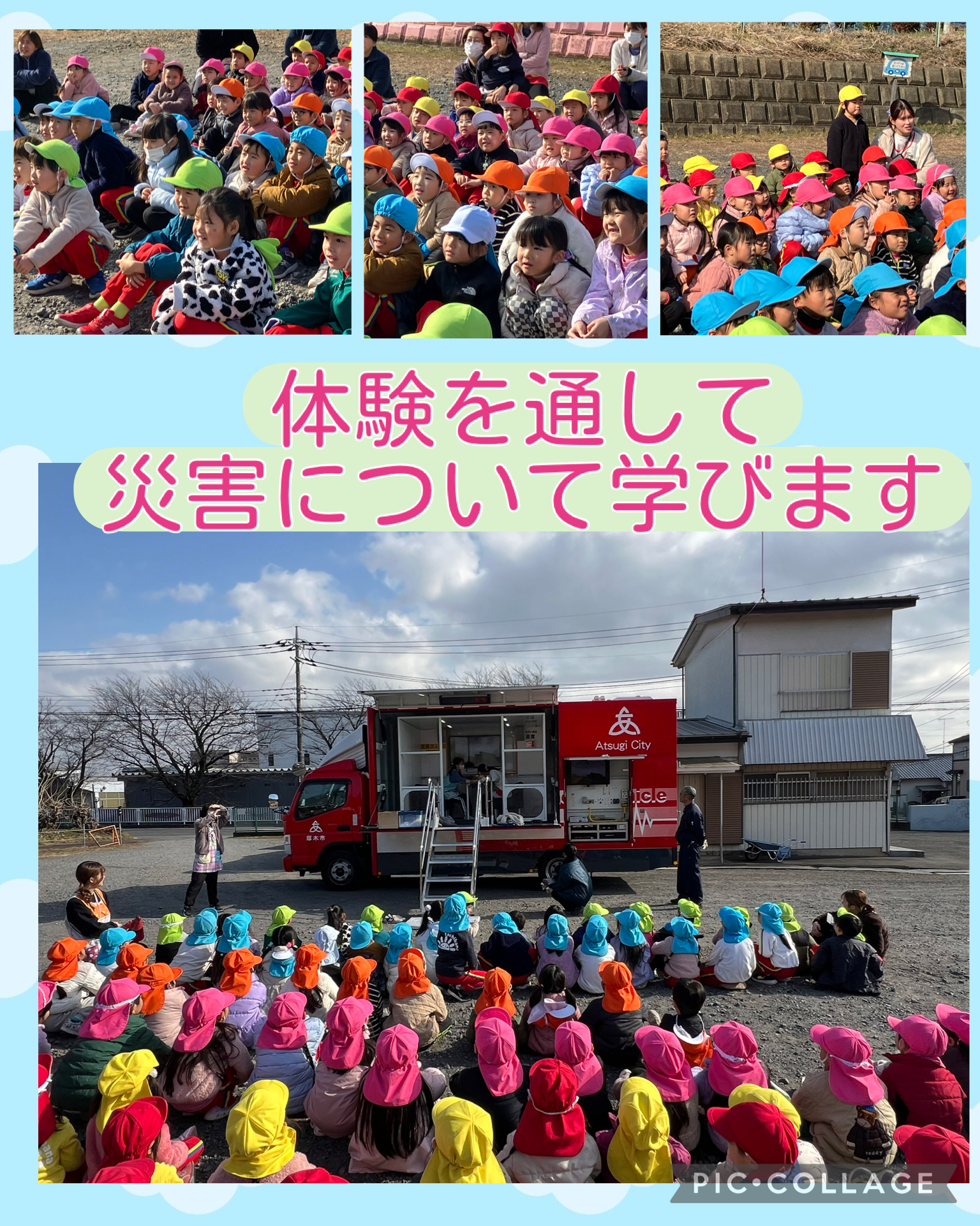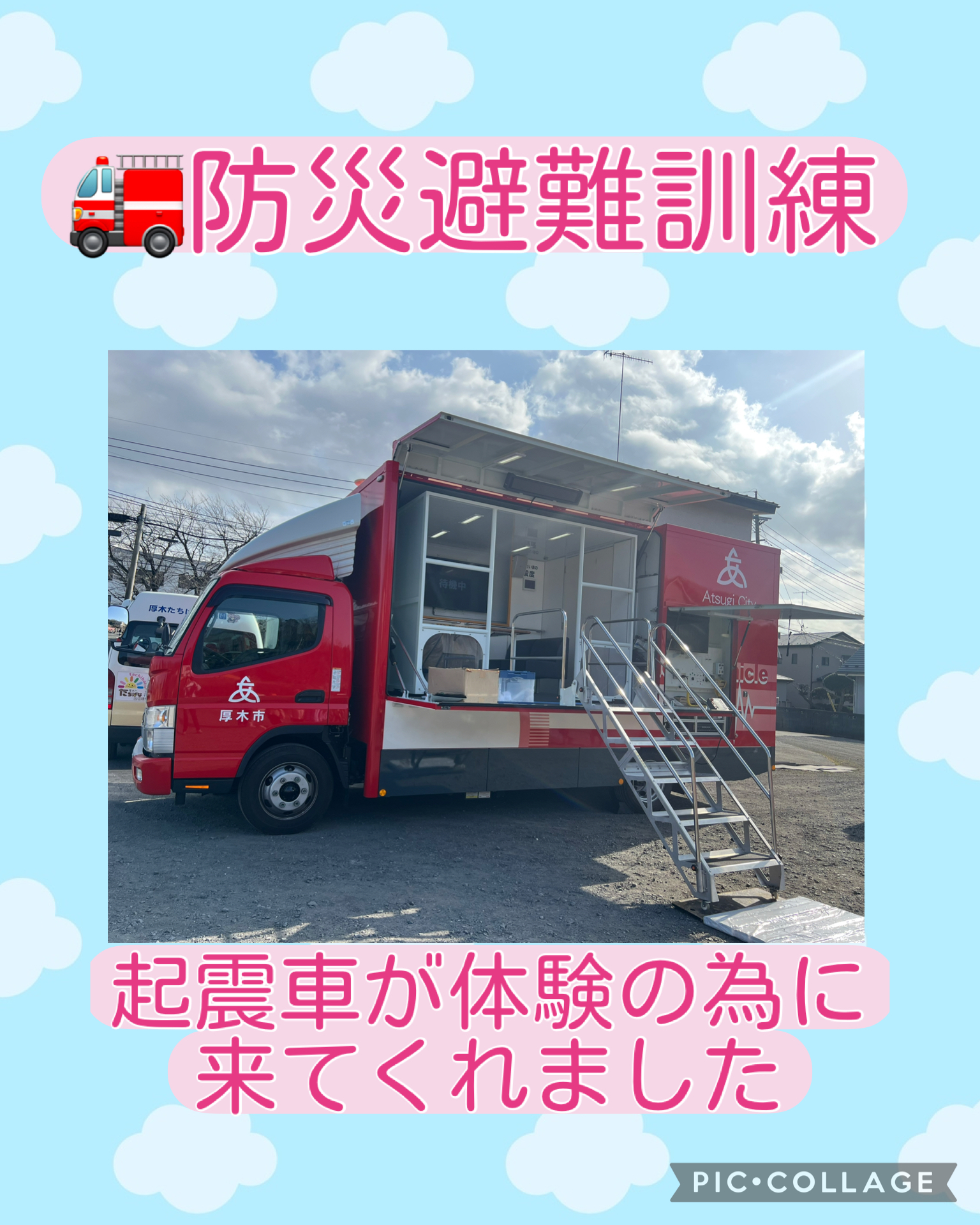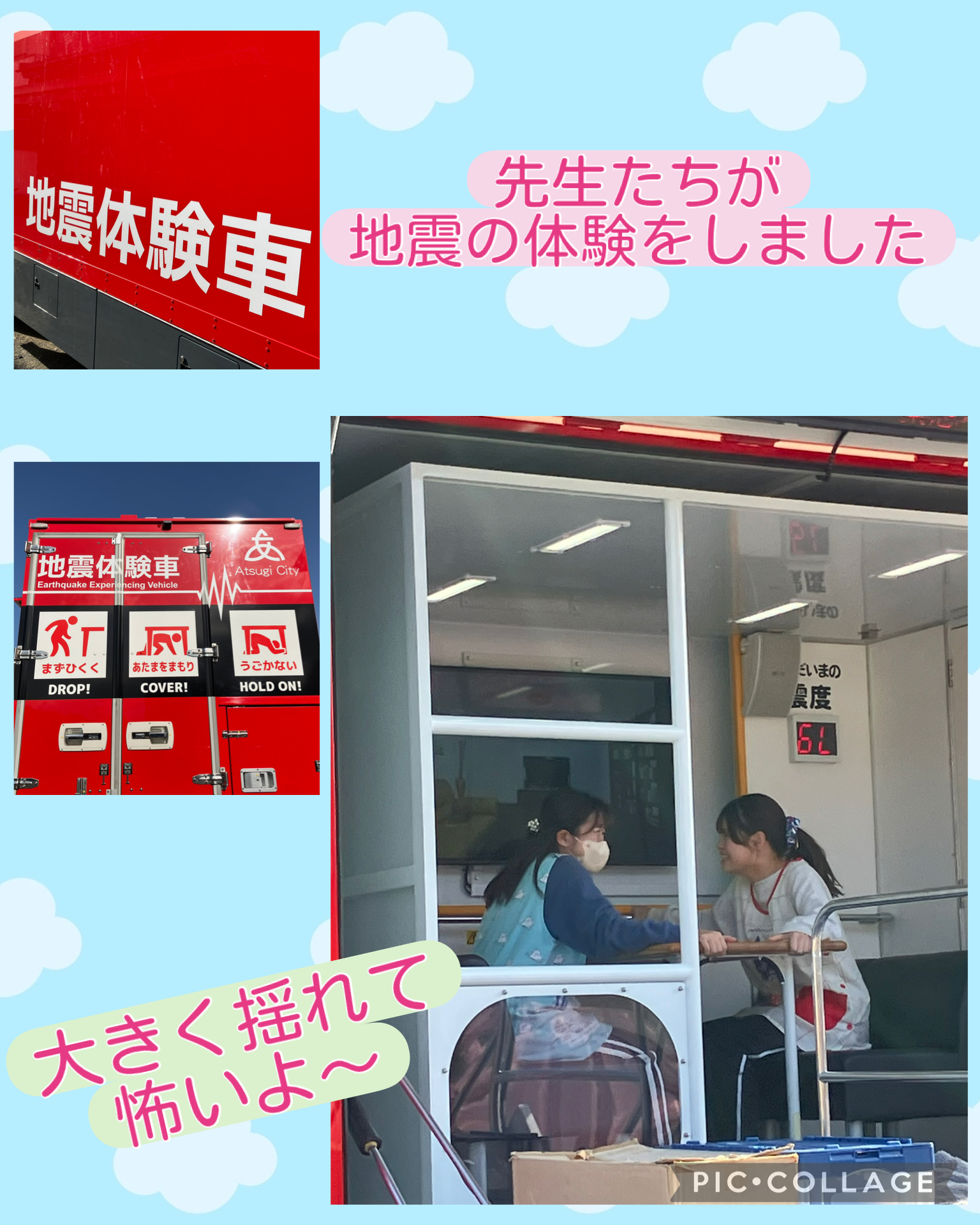 今日は防災訓練を行いました。起震車を担任の先生たちが体験し、子どもたちは揺れの大きさに驚きながら真剣に様子を見ていました。